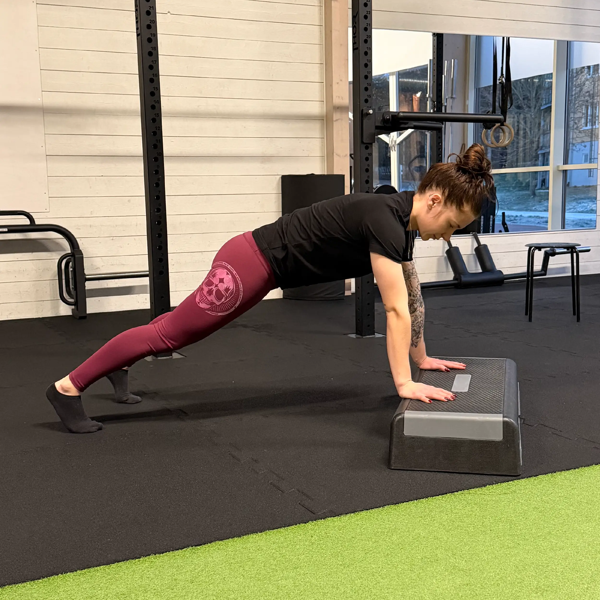 Tips: Ju högre yta, desto lättare – Om det känns för tungt, använd en högre bänk eller gör armhävningen mot en vägg. Ju lägre yta, desto tyngre – För att öka svårighetsgraden, välj en lägre bänk eller låda.